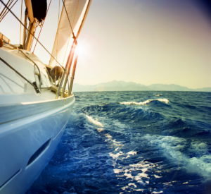 Yacht Sailing against sunset.Sailboat.Sepia toned